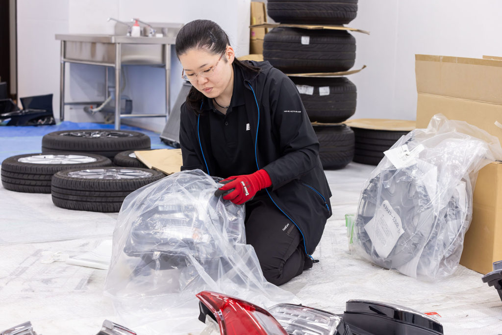 車の中古部品をクリーニング・検品作業を行なっています!ヘッドライト、ボンネット、バンパー等色々な種類の部品を扱っています♪